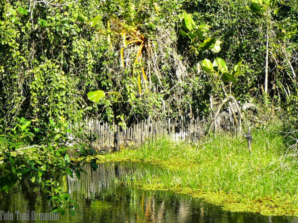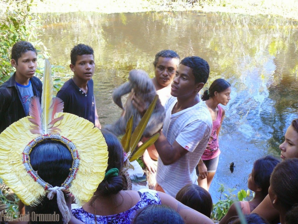 Depois do almoço compartilhado na Escola da Aldeia, se improvisou uma alegre caravana que levou o bicho preguiça até as terras da Retomada, longe das casas, e junto ao córrego do Ouro, braço do Rio Santo Antonio. Sem muitas cerimonias nem formalidades, o irmão do reino animal foi colocado delicadamente numa árvore, e deixado a vontade onde deve estar.